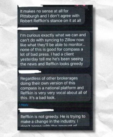“I’m curious exactly what we can and can’t do with syncing to Zillow now like what they’ll be able to monitor,” the documents show another agent writing. “None of this is good for compass a lot of bad press. I had a client yesterday tell me he’s been seeing in the news and Reffkin looks greedy.”
