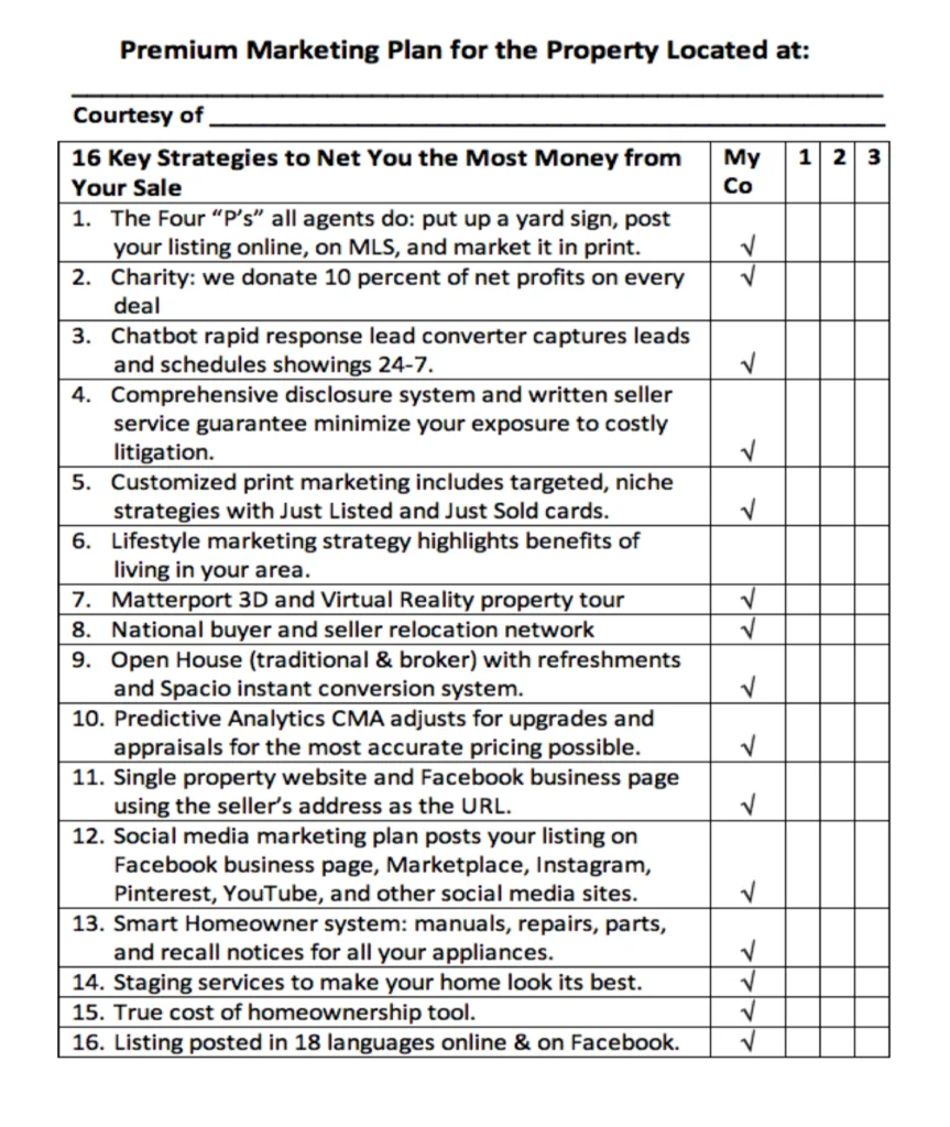 For sellers, include a premium marketing plan. This approach has worked for decades. The premium marketing plan below was one I drafted in 2024, and it’s still as relevant today as it was back then.