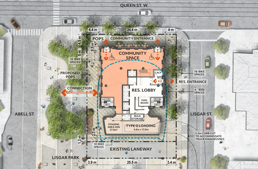 However, the OLT case file from January reveals that the City’s real qualm with the proposal comes back to its height — 102 metres in the initial submission, and 98 metres in the most recent revision. The City asserts that the proposed height undermines its Queen Street West Planning Study, represents overdevelopment rather than optimization of the area’s infrastructure, and “fails to enhance QSW’s sense of place and character.”