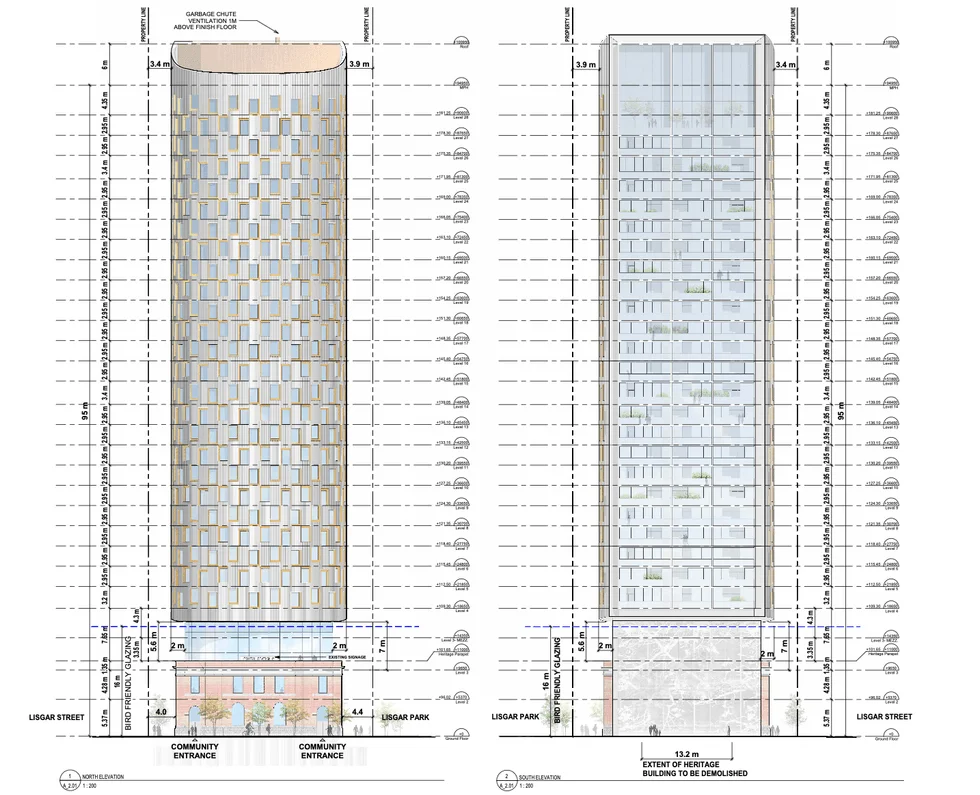 Though the application was revised three times, the general conservation strategy for the Postal Station C has not changed, the OLT notes. “The Heritage Building facades will remain in situ and the tower will extrude from the rear building elevation. All conservation measures described, including reinstatement of openings and alterations for accessibility remain part of the May, 2025 permit requests.”
