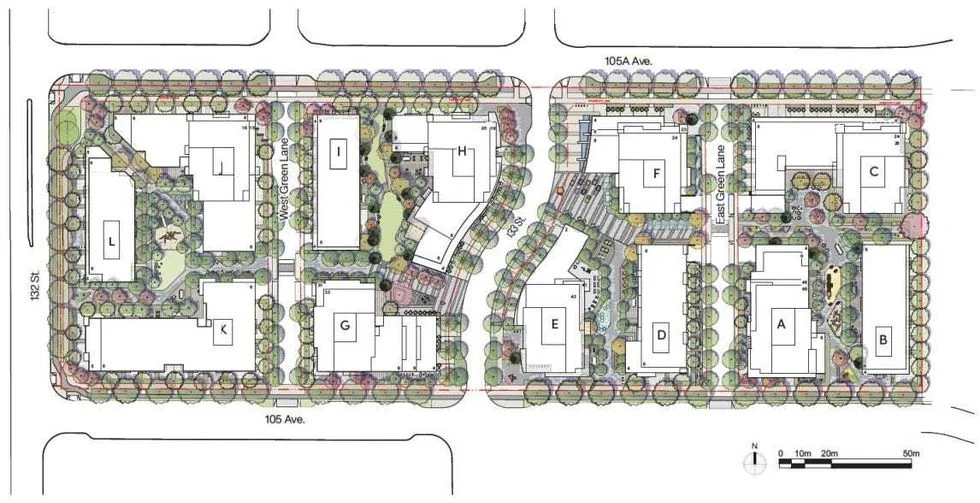 The existing 133 Street that runs along Whalley Athletic Park would be extended through — and roughly bisect — the site, with the first four phases making up the eastern half of the site, and latter four phases making up the western half of the site.
