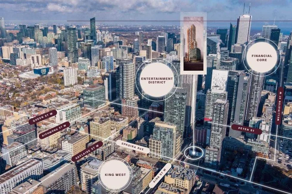 The site is 401-415 King Street West, located at the southeast corner of the intersection with Spadina Avenue, a few blocks away from Rogers Centre. The site was assembled by Toronto-based real estate investment firm Terracap, which acquired 401-409 King Street West in 1994 for $850,000 and then 415 King Street West in 2007 for an undisclosed price, according to the company’s website.