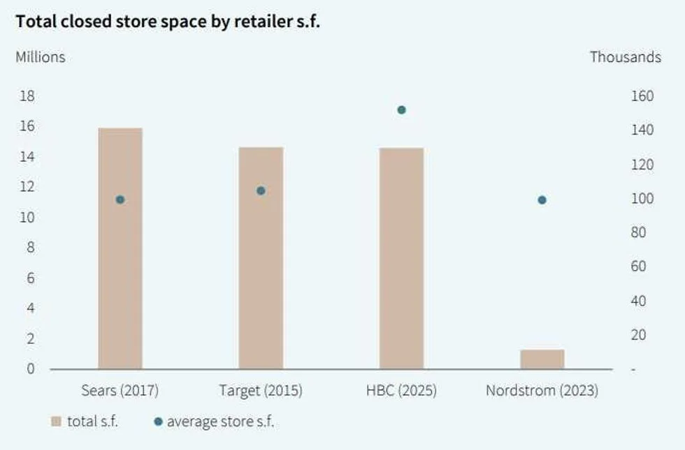 According to a recent report published by commercial real estate services firm JLL, the amount of space HBC vacated totals to approximately 15 million sq. ft; approximately the same amount of space vacated by Target in 2015, and just slightly less than the amount vacated by Sears in 2017 — although HBC had a larger average store size than both of those retailers.