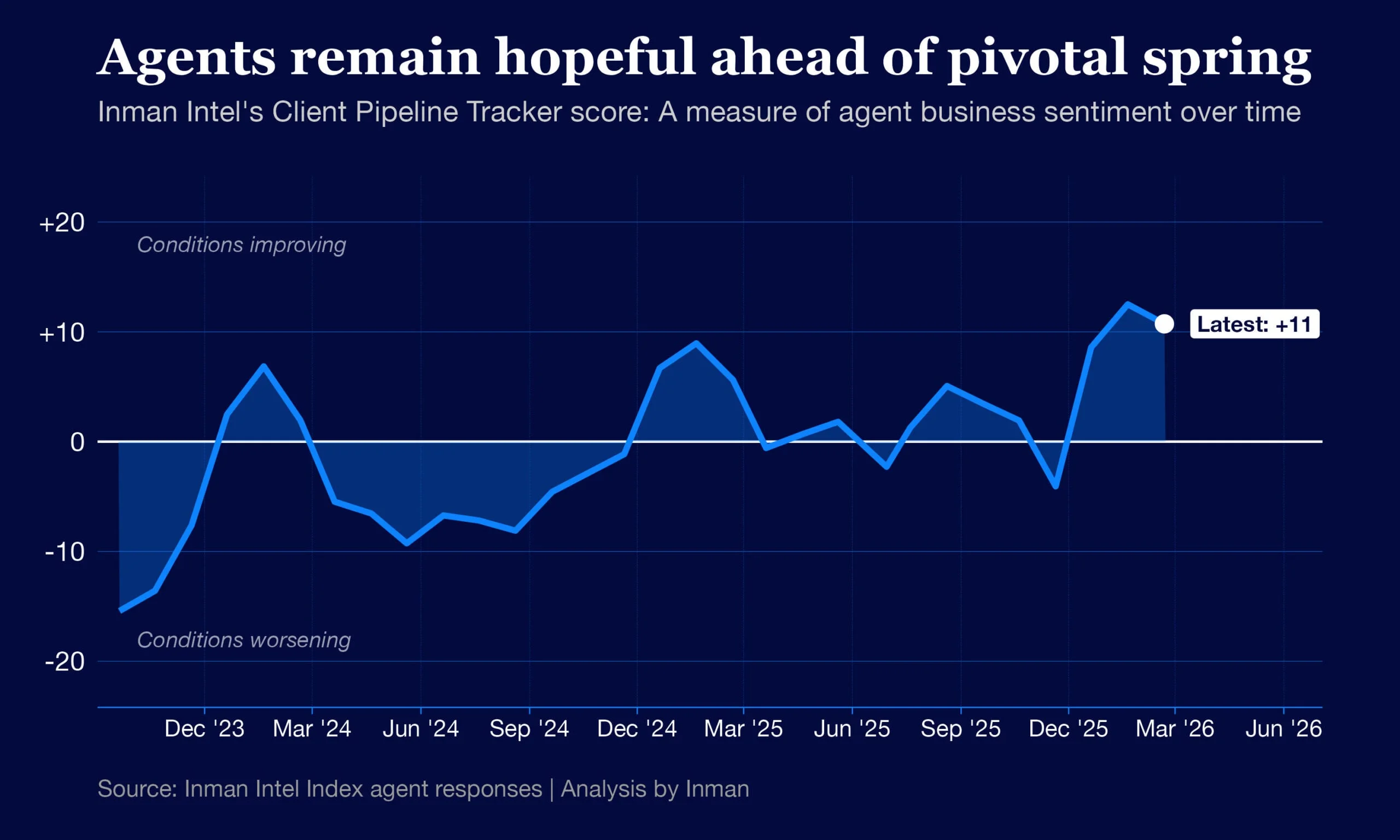 A significantly negative combined score, on the other hand, falls closer to -20. That’s a bit lower than where the industry stood in September 2023, the first time Intel surveyed agents about their pipelines.