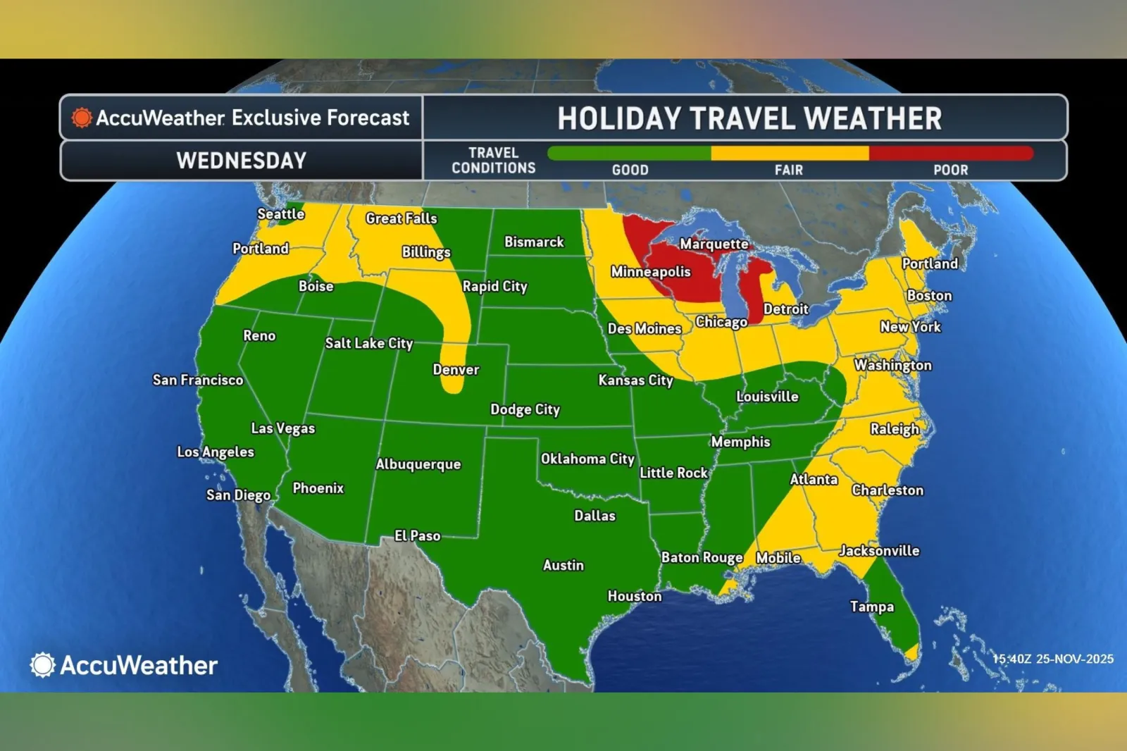 According to AccuWeather’s forecast map for Wednesday, states with the poorest travel conditions include Michigan, Wisconsin, and Minnesota.