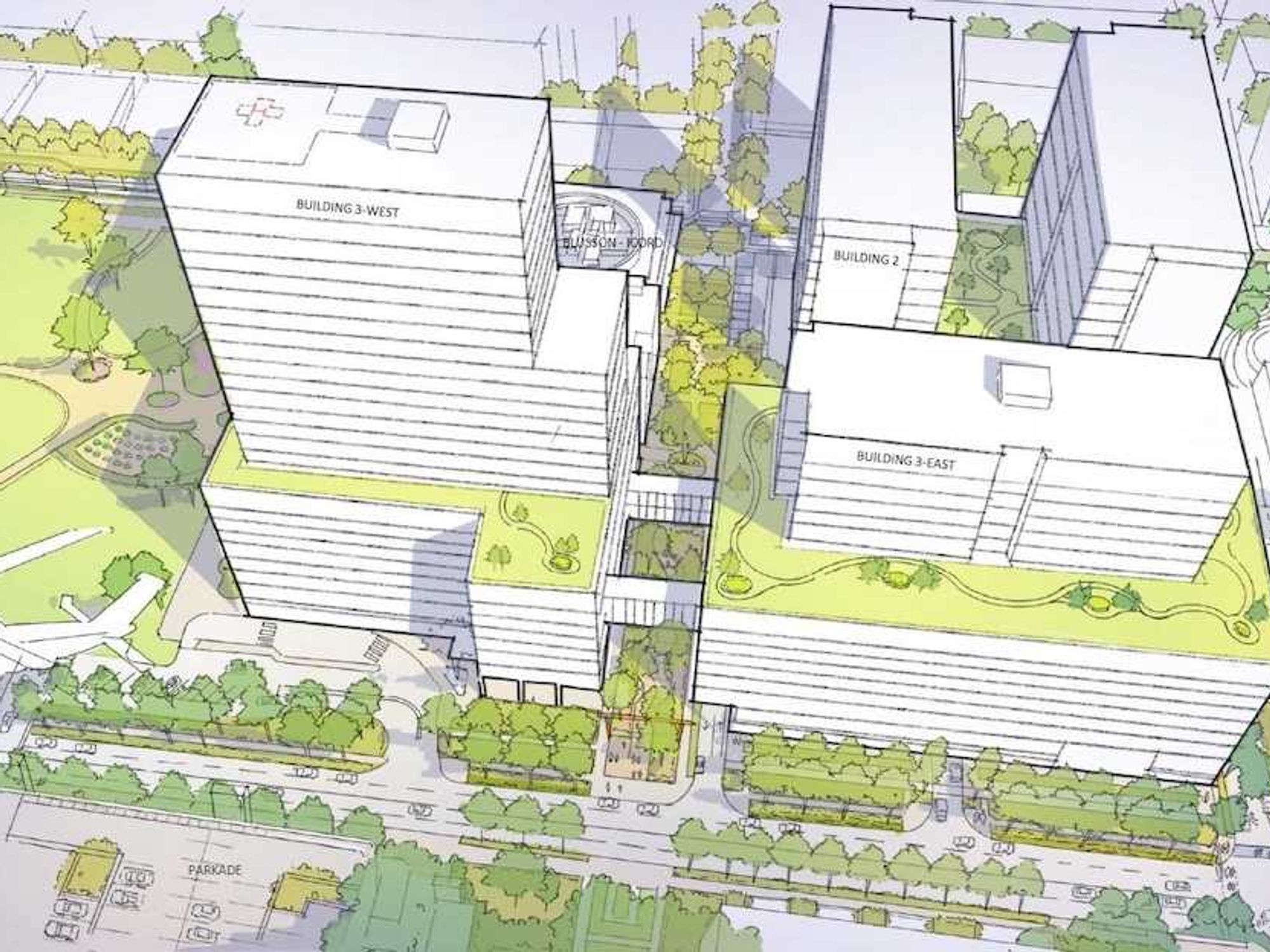 Each phase is also expected to include enhancements to the public realm that will “strengthen the identity of the campus, support intuitive wayfinding, and provide a meaningful connection to nature for all who use the site.” The rezoning application also states that the redevelopment plan “ensures that a baseline amount of open space is preserved permanently throughout all phases of development.”