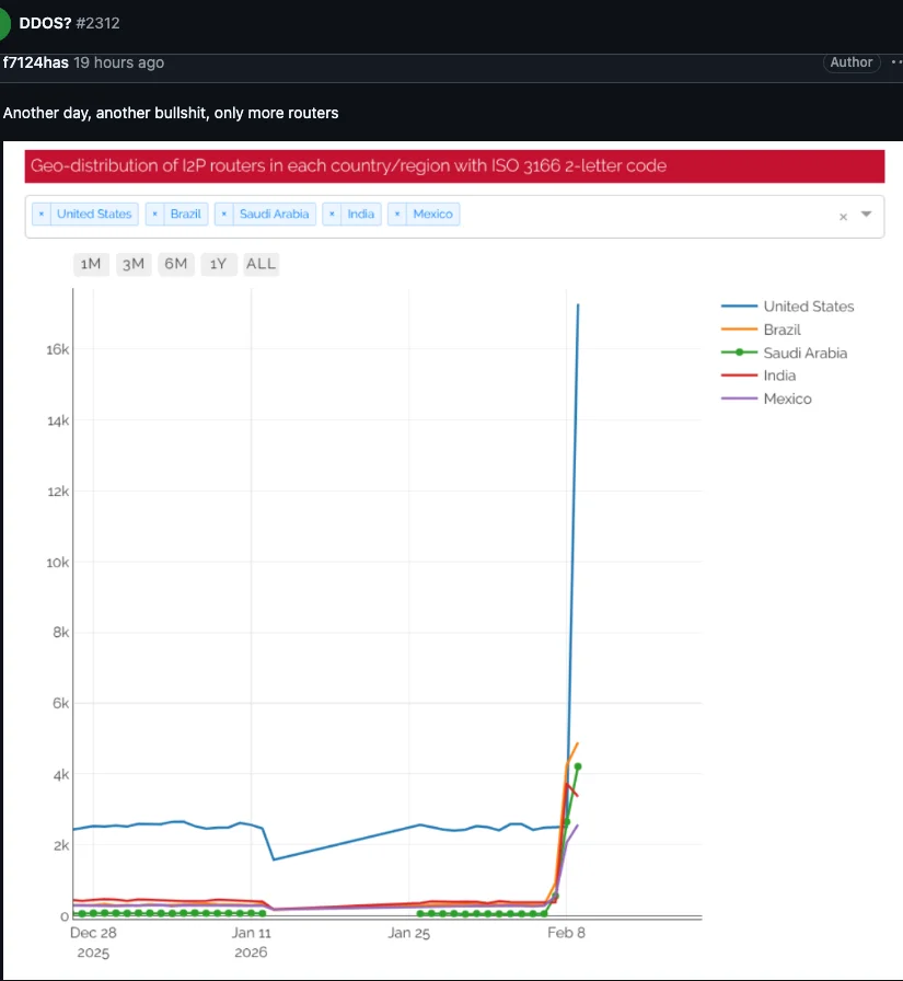 On February 3, I2P users began complaining on the organization’s GitHub page about tens of thousands of routers suddenly overwhelming the network, preventing existing users from communicating with legitimate nodes. Users reported a rapidly increasing number of new routers joining the network that were unable to transmit data, and that the mass influx of new systems had overwhelmed the network to the point where users could no longer connect.