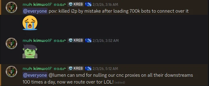 The same day that I2P users began noticing the outages, the individuals in control of Kimwolf posted to their Discord channel that they had accidentally disrupted I2P after attempting to join 700,000 Kimwolf-infected bots as nodes on the network.