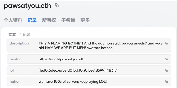 An ENS record used by the Kimwolf operators taunts security firms trying to take down the botnet’s control servers. Image: XLab.