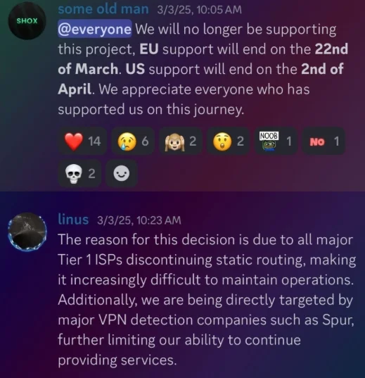 In February 2025, AT&T announced that effective July 31, 2025, it would no longer originate routes for network blocks that are not owned and managed by AT&T (other major ISPs have since made similar moves). Less than a month later, Shox and Linus told customers they would soon cease offering static ISP proxies as a result of these policy changes.