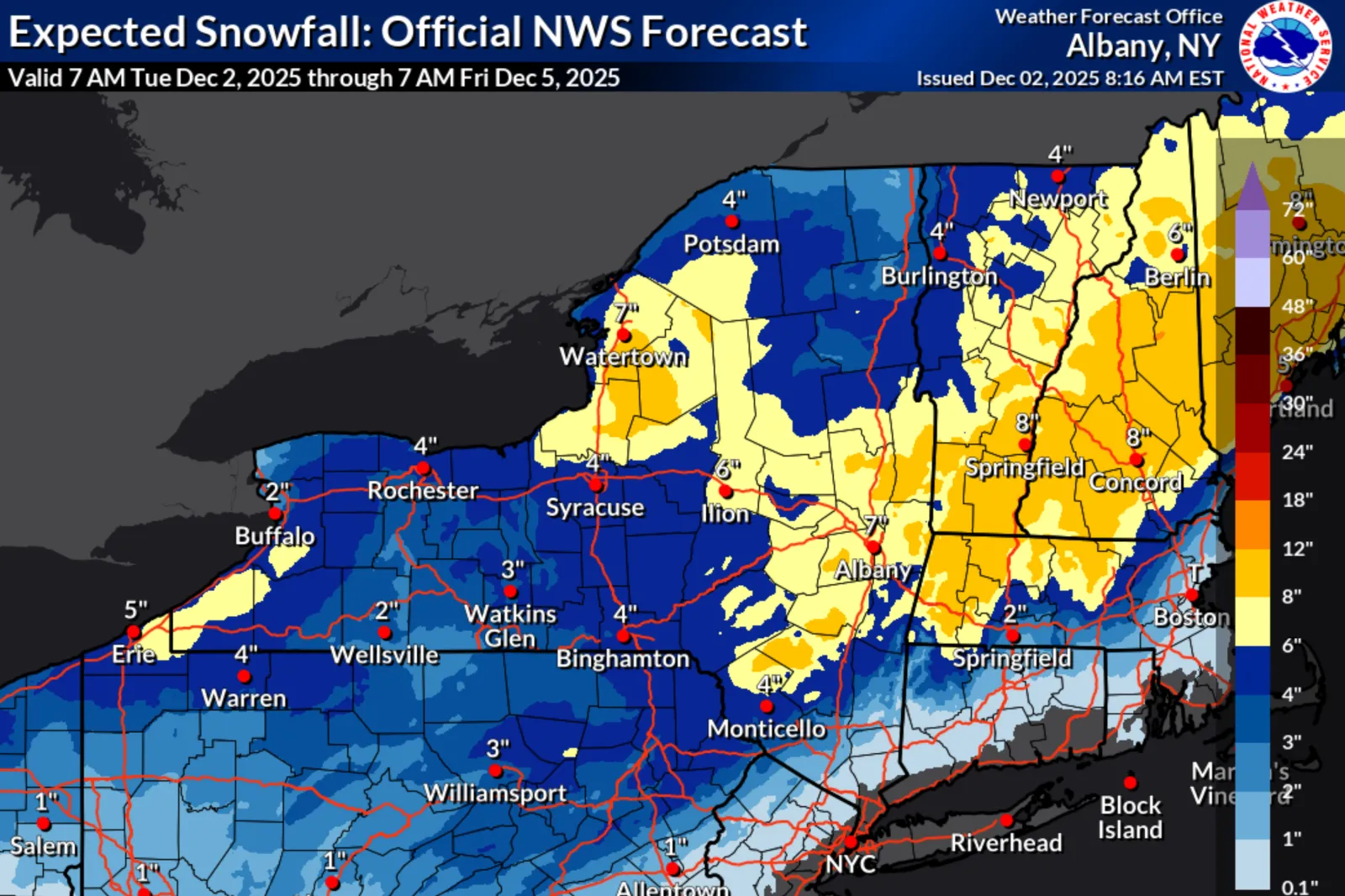 Albany County and Monticello in Sullivan could get up to 9 inches, and certain places in Herkimer County, including Ilion, and Onondaga County, including Syracuse, could get up to 7 inches.